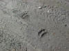 We had been working steadily for some time when Swanny, placing stakes well ahead of the others, observed a set of small moose tracks paralleled by a set of unusually large wolf tracks in the trail. Between the next two stations he observed a set of tracks left by a relatively large black bear. Both sets of tracks were reasonably fresh, certainly within the past 12 hours. The image on the left shows both the moose and wolf tracks, the one at left center is a detail of the wolf tracks, at right center the bear tracks and on the far right shows Swanny's hand in the bear tracks to add a sense of scale.