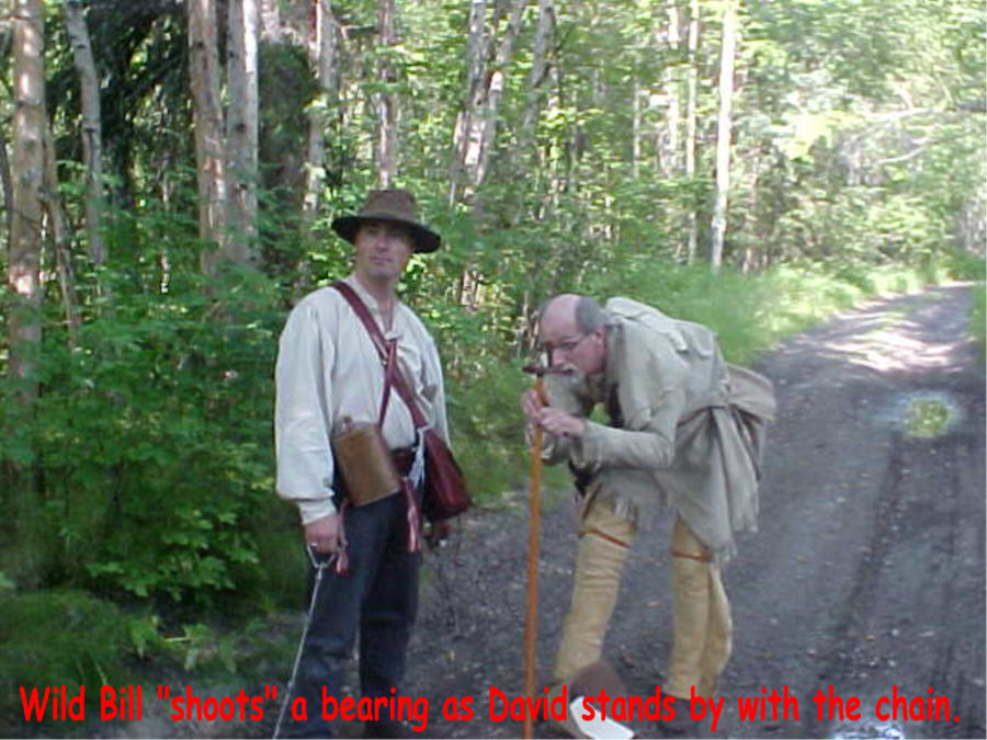 Having measured the fork in the road we proceeded down the trail, shooting the bearings between stations marked with wooden staves and then measuring the distance using a 33 foot (two pole) surveyor’s chain. A full Gunter’s chain is 66 feet (four rods) but it was not uncommon for frontier surveyors to use the shorter two-pole chain as it is easier to manage in rough terrain or brush. We had only shot a couple of stations when we realized that our bearings did not seem to be true when compared to a pocket compass. All four us are reasonably well educated and reasonably intelligent people, but we were unable to figure out the cause of what appeared to be a fairly significant error. Finally we agreed on precisely how we would read the bearings.